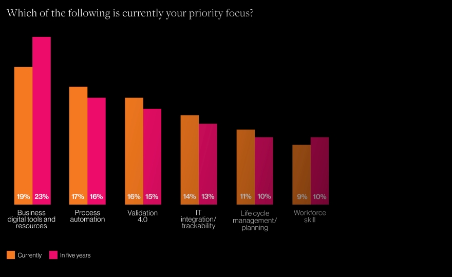 Rooted in deep research around the implementation of pharma 4.0, our benchmarking report surveyed over 180 life science industry leaders, conducted 12 interviews with leading pharma companies (six companies ranked in the top 20), and hosted a roundtable discussion with ISPE to collect data and inform on industry focuses.